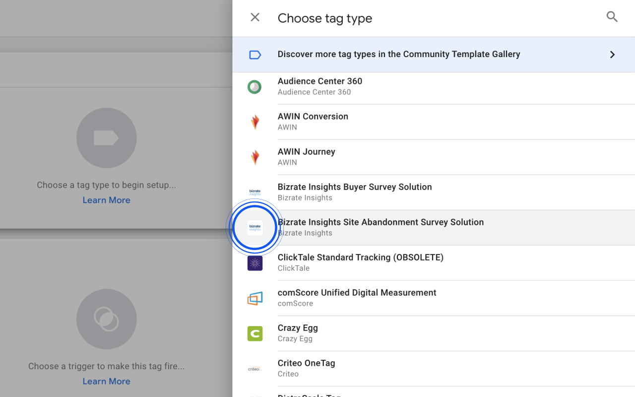 Locate and click on Bizrate Insights Site Abandonment Solution. (Tip: Click on the search icon to the right of “Choose a tag type” and type in “bizrate”
